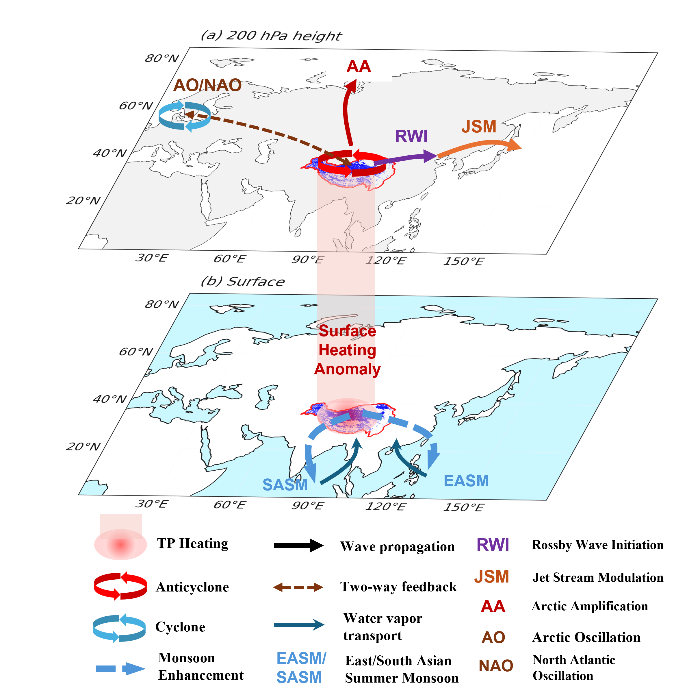 研究團隊依托長期野外觀測、遙感反演和過程模擬,完整描繪了“地表能量分配→邊界層演變→季風與行星波響應”的多尺度反饋鏈條。結(jié)果表明,多年凍土的“凍融記憶”,即凍結(jié)或融化狀態(tài)在季節(jié)間延續(xù)并影響后續(xù)熱量與水分過程,并對土壤熱物理特性及潛熱/顯熱分配造成影響,共同決定了能量釋放的節(jié)奏與路徑,進而影響邊界層穩(wěn)定性、對流觸發(fā)和大氣遙相關(guān)結(jié)構(gòu)。