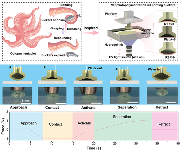 作為自然界的一類(lèi)“界面工程大師”—章魚(yú),其吸盤(pán)結(jié)構(gòu)依靠可形變的柔軟肌壁精確調(diào)節(jié)腔內(nèi)壓力,既能在干濕環(huán)境、光滑與粗糙表面間迅速完成粘/脫附切換,又能精準(zhǔn)控制吸附力大小,這種高度自適應(yīng)特性使其在水下抓取、生物醫(yī)療等場(chǎng)景中具備不可替代的優(yōu)勢(shì)。順應(yīng)機(jī)器人技術(shù)、生物工程與柔性電子等領(lǐng)域的快速發(fā)展,構(gòu)建具有章魚(yú)吸盤(pán)式功能的仿生粘附器件,已成為破解傳統(tǒng)剛性粘附設(shè)備(如真空吸盤(pán)、電磁吸盤(pán))在復(fù)雜界面適應(yīng)性差、且易損傷脆弱目標(biāo)(如生物組織、精密零件)等痛點(diǎn)的關(guān)鍵路徑。