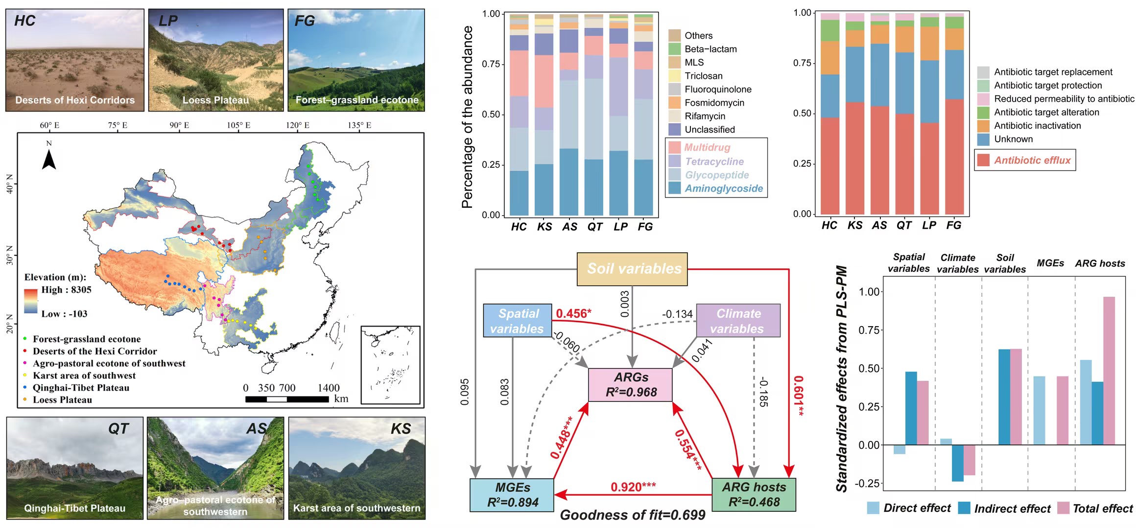 中國科學(xué)院西北生態(tài)環(huán)境資源研究院李玉強研究員團隊在我國4300公里的范圍內(nèi),針對森林、草原、沙漠等六類典型陸地自然生態(tài)系統(tǒng),設(shè)立了42個采樣點,運用宏基因組學(xué)方法,系統(tǒng)揭示了表層土壤中ARGs的分布特征與傳播機制。
