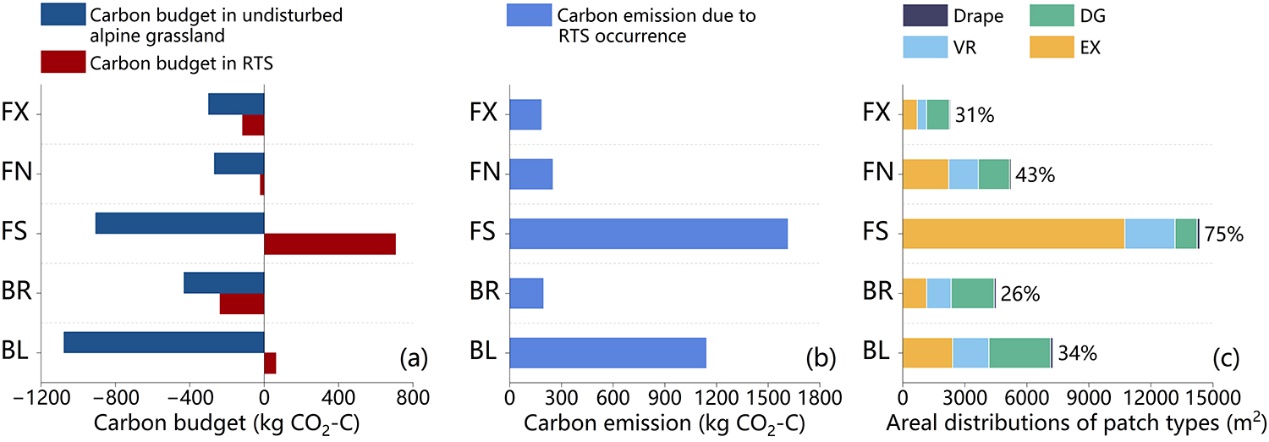 青藏高原是全球最大的高海拔多年凍土區(qū),儲存著大量土壤有機碳。近年來,隨著氣候變暖、多年凍土廣泛退化,熱融滑塌、熱融溝和熱融湖塘等反映多年凍土快速融化現(xiàn)象的熱喀斯特地貌廣泛發(fā)育,其對高寒生態(tài)系統(tǒng)碳循環(huán)和氣候反饋的影響備受關(guān)注。然而,與熱融溝和熱融湖塘相比,無論是青藏高原還是環(huán)北極多年凍土區(qū),熱融滑塌(retrogressive thaw slumps,RTS)對凍土生態(tài)系統(tǒng)碳動態(tài)的影響都缺乏系統(tǒng)性研究。