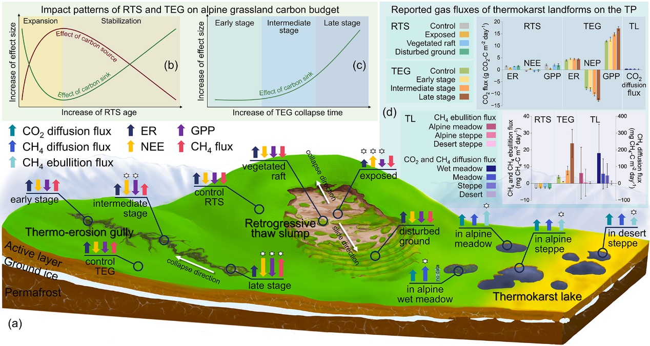 該研究成果以Thaw slumps alter ecosystem carbon budget in alpine grassland on the Tibetan Plateau為題,發(fā)表于國際期刊Nature Communications。西北研究院蔣觀利研究員為論文第一作者,吳青柏研究員為通訊作者。該研究得到國家重點研發(fā)計劃項目、國家自然科學基金面上項目和甘肅省自然科學基金項目的資助。