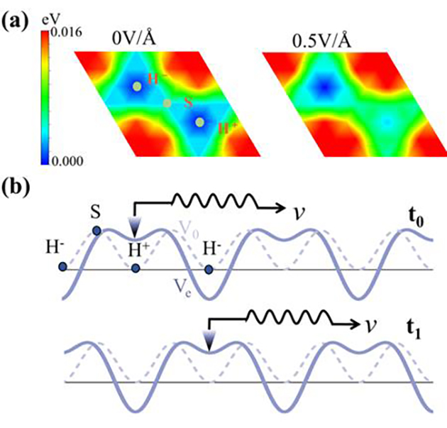 圖2. (a)不同電場下,雙層h-BN的摩擦勢能面;(b)系統(tǒng)沿最佳滑移路徑(H+→S→H-→S→H+)的勢能曲線,虛線和實(shí)線分別表示無外場和施加交變電場的結(jié)果。