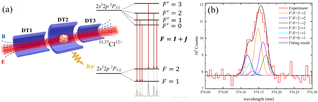圖1. (a) SH-HtscEBIT中Cl12+離子的束縛態(tài)和發(fā)射態(tài)的能級圖,包括1??22??22??2P價態(tài)的超精細(xì)結(jié)構(gòu)。超精細(xì)能級用總角動量F=I+J標(biāo)記,核自旋??= 3∕2; (b) 類硼Cl12+離子的發(fā)射光譜,顯示基態(tài)1s22s22p 2P精細(xì)結(jié)構(gòu)能級間的M1躍遷(含超精細(xì)結(jié)構(gòu))。黑色實線為擬合結(jié)果,彩色實線和虛線分別代表35Cl和37Cl的超精細(xì)結(jié)構(gòu)譜線。