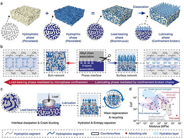 在人體關(guān)節(jié)中,軟骨依托多尺度膠原網(wǎng)絡(luò)、多相組分及其界面的協(xié)同作用,構(gòu)建出兼具高承載與超低摩擦的天然潤滑系統(tǒng)。基于這一特性,水凝膠作為有潛力的人工軟骨替代材料備受關(guān)注。然而,傳統(tǒng)潤滑水凝膠往往因結(jié)構(gòu)均一性而陷入兩難境地,提高整體網(wǎng)絡(luò)致密度雖能增強力學(xué)性能,卻會削弱表面水合與潤滑能力;單純追求低摩擦,又會使材料在高載荷下迅速變形、蠕變甚至失效。這種長期存在的性能權(quán)衡,嚴(yán)重制約了水凝膠在高載荷、長壽命潤滑場景中的實際應(yīng)用。