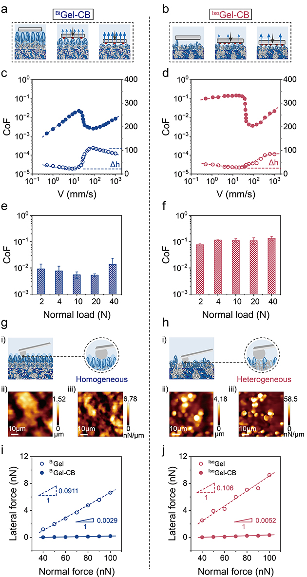 圖4.(a)?BiGel-CB和(b)?IsoGel-CB的潤滑機制示意圖。(c, d)?BiGel-CB和IsoGel-CB的Stribeck曲線及相應(yīng)水合高度變化。(e, f) 在邊界潤滑狀態(tài)下,摩擦系數(shù)隨載荷的變化。(g, h)?BiGel-CB和IsoGel-CB表面的AFM高度圖。(k, l) 利用LFM測得的側(cè)向力-法向力曲線及計算得出的微觀摩擦系數(shù)。