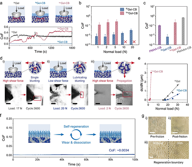 圖5.(a) 摩擦測試示意圖及BiGel、BiGel-CB和IsoGel-CB對應(yīng)的摩擦系數(shù)曲線。(b)?BiGel-CB和IsoGel-CB摩擦系數(shù)隨載荷的變化。(c) PMAA-CB、BiGel-CB、PMAAm-CB和IsoGel-CB樣品的平均摩擦系數(shù)。(d) 摩擦裂紋擴展示意圖及 i)?BiGel, ii)?BiGel-CB, iii)?IsoGel-CB的裂紋光學(xué)圖像(比例尺:200 μm)。(e)?BiGel、BiGel-CB和IsoGel-CB的界面裂紋擴展速率隨載荷的變化。(f)?BiGel-CB在50 N法向載荷下的長期潤滑性能。(g)?BiGel-CB在PBS溶液中摩擦測試前后的表面光學(xué)圖像:i) 摩擦前,ii) 摩擦后,iii) 摩擦邊界(比例尺:200 μm)。