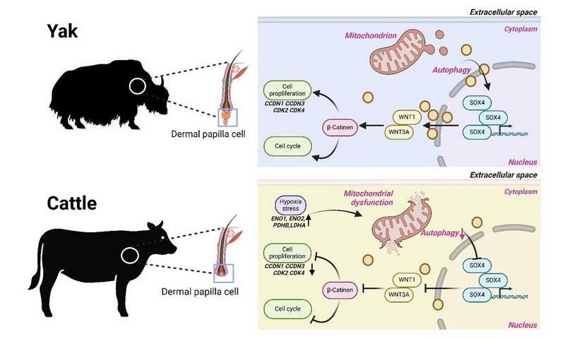 研究團隊進一步利用ATAC-seq與ChIP-qPCR發(fā)現(xiàn)了轉(zhuǎn)錄因子SOX4可直接結(jié)合WNT1與WNT3A基因的啟動子區(qū)域,且這一結(jié)合對基因的轉(zhuǎn)錄激活作用通過雙熒光素酶實驗得到驗證。SOX4的表達受自噬水平調(diào)控,激活自噬可挽救SOX4抑制劑對DP細(xì)胞增殖的抑制作用。該調(diào)控通路在牦牛體中表現(xiàn)出更強的信號活性,通過促進DP細(xì)胞周期進程、增強細(xì)胞增殖能力來維持毛囊穩(wěn)態(tài);同時,該通路還能改善線粒體結(jié)構(gòu)完整性以抵御氧化應(yīng)激,從而可能促進毛囊生長,系統(tǒng)性增強牦牛對高原寒冷環(huán)境的生存適應(yīng)能力。總之,研究團隊從單細(xì)胞水平解析了牦牛毛囊適應(yīng)高原寒冷環(huán)境的分子特征,為理解動物對高原極端環(huán)境的適應(yīng)機制提供了重要基礎(chǔ)數(shù)據(jù)。