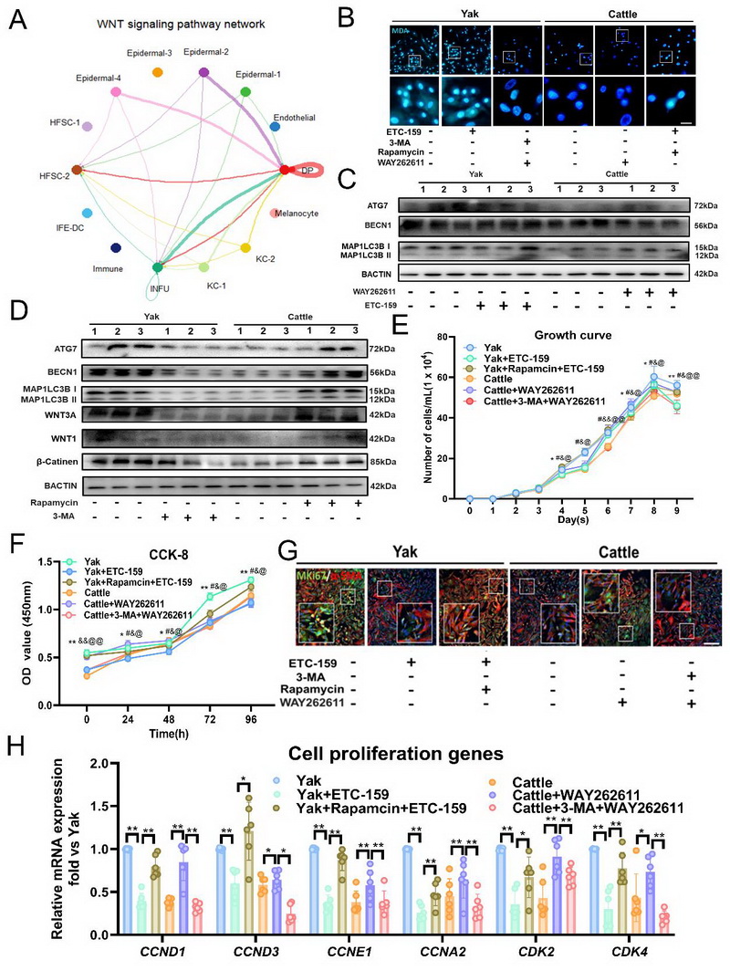 文章代表圖:DP細(xì)胞中自噬與增殖的相互作用由WNT/β-Catenin通路介導(dǎo)。(A)DP細(xì)胞單細(xì)胞數(shù)據(jù)中WNT信號通路的細(xì)胞相互作用圖。(B)不同處理后牦牛和普通牛DP細(xì)胞的MDA活細(xì)胞染色。(C)牦牛、牦牛+ETC-159、普通牛和普通牛+WAY262611處理組DP細(xì)胞中ATG7、BECN1和LC3I/II的蛋白質(zhì)印跡分析(n=3)。(D) 牦牛、牦牛+3-MA、普通牛和普通牛+雷帕霉素處理組DP 細(xì)胞中ATG7、BECN1、LC3I/II、WNT3A、WNT1和β-Catenin的蛋白質(zhì)印跡分析(n=3)。(E-F)牦牛、牦牛+ETC-159、牦牛+雷帕霉素+ETC-159、普通牛、普通牛+WAY262611和普通牛+3-MA+WAY262611組DP細(xì)胞的生長曲線(n=9)和CCK-8檢測結(jié)果(n=4)。(G)不同處理組牦牛和普通牛DP細(xì)胞體外培養(yǎng)后PCNA和MKi67的代表性免疫熒光圖像(n=8)。(H)實時熒光定量PCR檢測細(xì)胞增殖相關(guān)基因CCND1、CCND3、CCNE1、CCNA2、CDK2和CDK4的mRNA表達情況(n=6)
