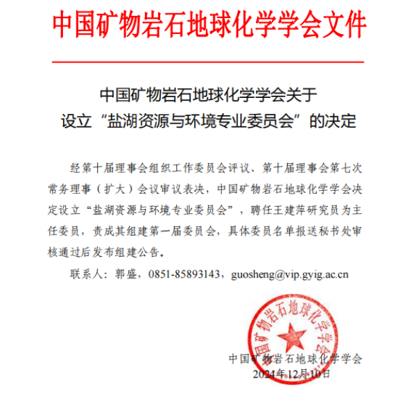 青海鹽湖所牽頭申報(bào)鹽湖資源與環(huán)境專業(yè)委員會(huì)獲中國礦物巖石地球化學(xué)學(xué)會(huì)批準(zhǔn)設(shè)立
