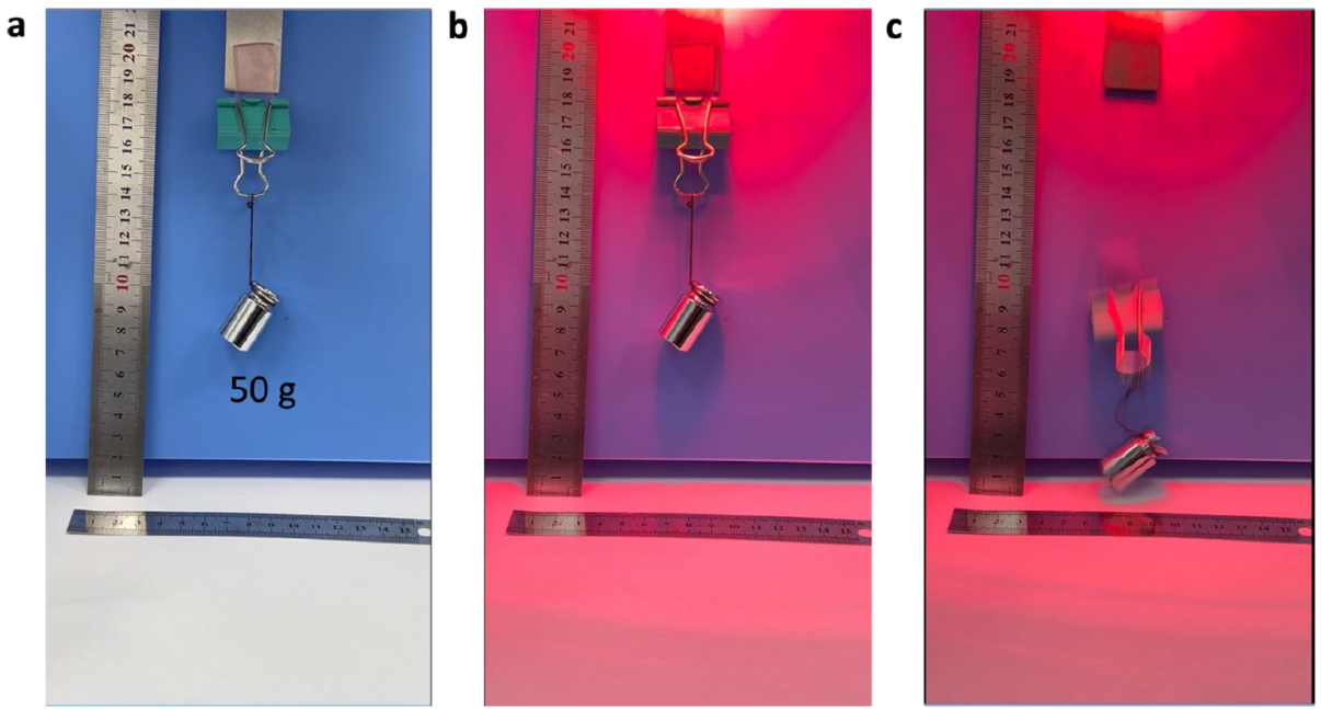 3. 響應(yīng)速度:光照觸發(fā)脫黏在幾秒內(nèi)即可完成,真正實(shí)現(xiàn)了用之即黏,取之即脫。正如下圖中所示,研究團(tuán)隊(duì)演示了該材料在不銹鋼基板上的光熱響應(yīng)行為,初始狀態(tài)下可穩(wěn)定懸掛50g重物,近紅外光照后因黏附性能切換而黏附失效。