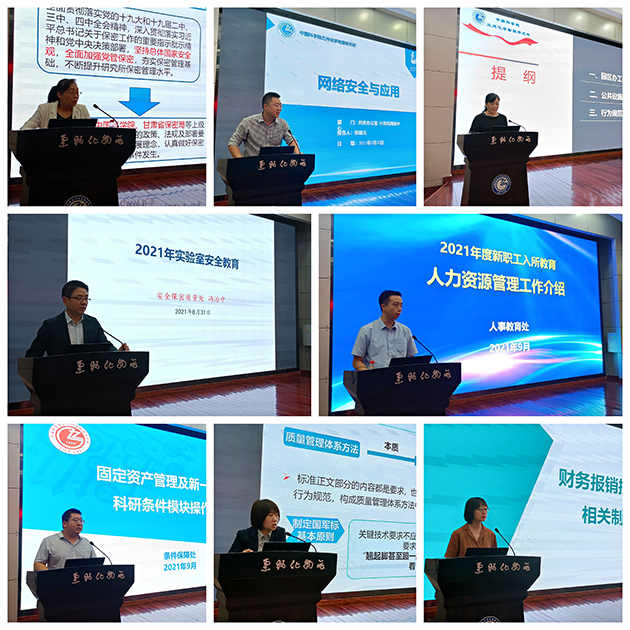 此次教育培訓分為業(yè)務(wù)培訓和專題培訓,業(yè)務(wù)培訓主要由所務(wù)辦公室、黨委辦公室、科研與規(guī)劃處、人事教育處、財務(wù)處、條件保障處、公共技術(shù)中心等分別就所情所況、黨建、論文發(fā)表、人事人才、財務(wù)制度與報銷管理流程、固定資產(chǎn)管理與政府采購、公共設(shè)施使用與行為規(guī)范、公共平臺建設(shè)與運維等進行了介紹。專題培訓主要包括實驗室安全教育、網(wǎng)絡(luò)安全與應用、保密教育、質(zhì)量管理體系建設(shè)與運行、館藏文獻與數(shù)據(jù)庫應用等,并就質(zhì)量管理體系和安全教育培訓組織了考試。