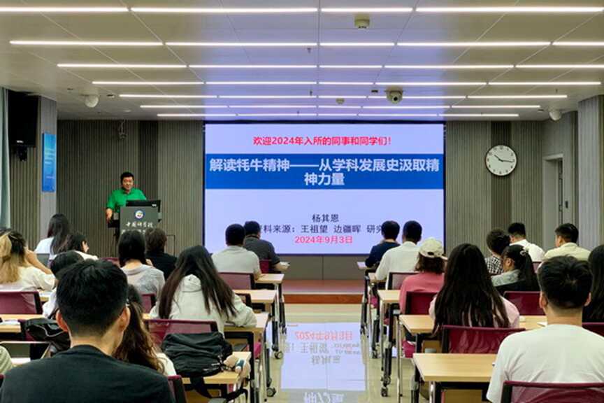 楊其恩作了“解讀牦牛精神——從學科發(fā)展史汲取精神力量”專題報告,報告從回顧研究所的發(fā)展歷程為切入點,向大家講述了“牦牛精神”蘊含的深刻意義和背后歷經(jīng)曲折、卓越堅守、不計報酬、但求貢獻的過往,希望作為“國家隊”、“國家人”的新生力量,大家能夠保持真誠與謙卑,抱利他之心、行利他之事,能夠心系“國家事”、肩扛“國家責”,面向國家需求、結合個人興趣,承先生前輩之創(chuàng)造、開科研范式變革之新局,做“牦牛精神”忠實地踐行者。